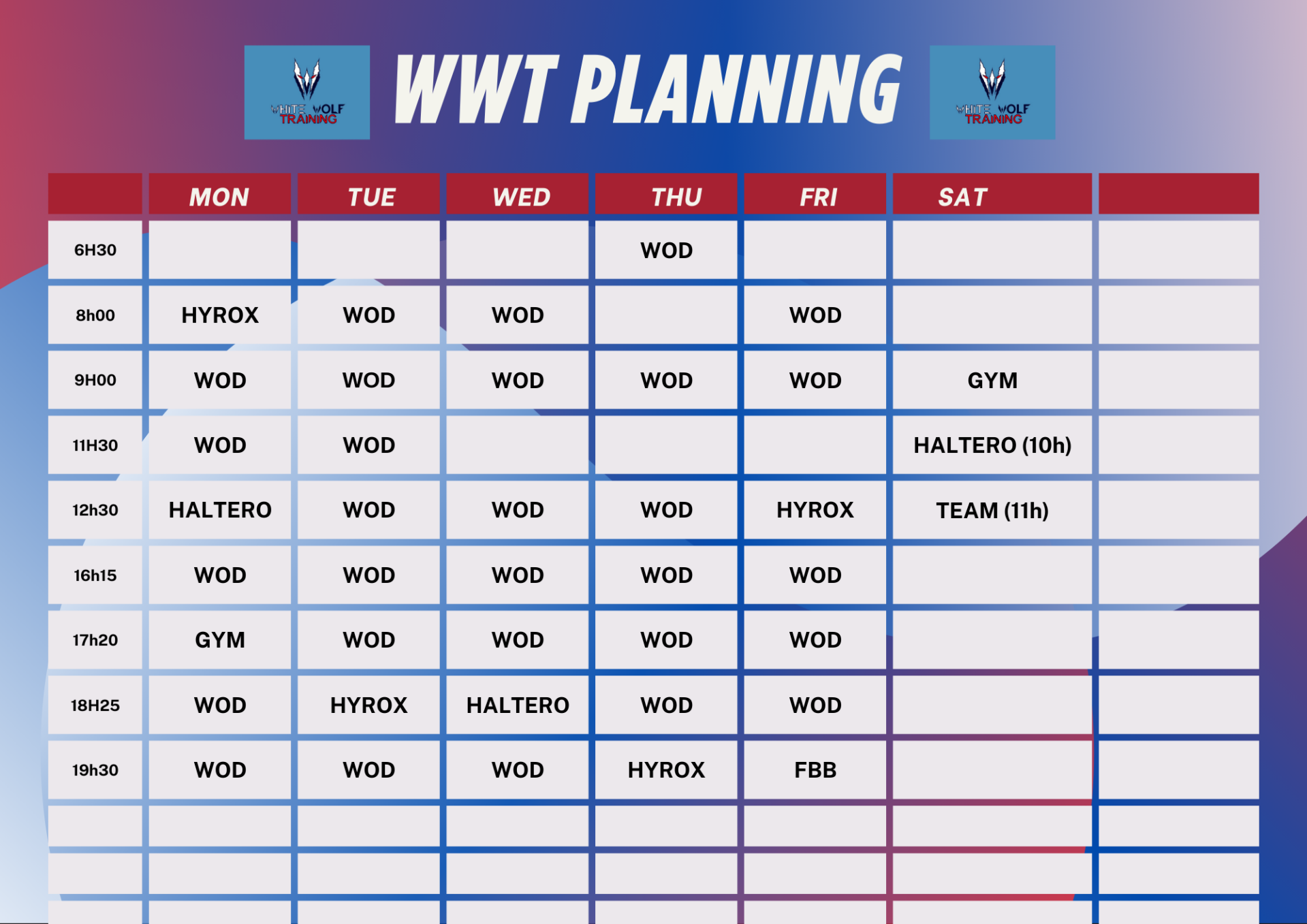 Chez White Wolf Training, nous sommes bien plus qu'une simple salle de sport : nous formons une communauté soudée, animée par la discipline, l'engagement et la quête de dépassement de soi.